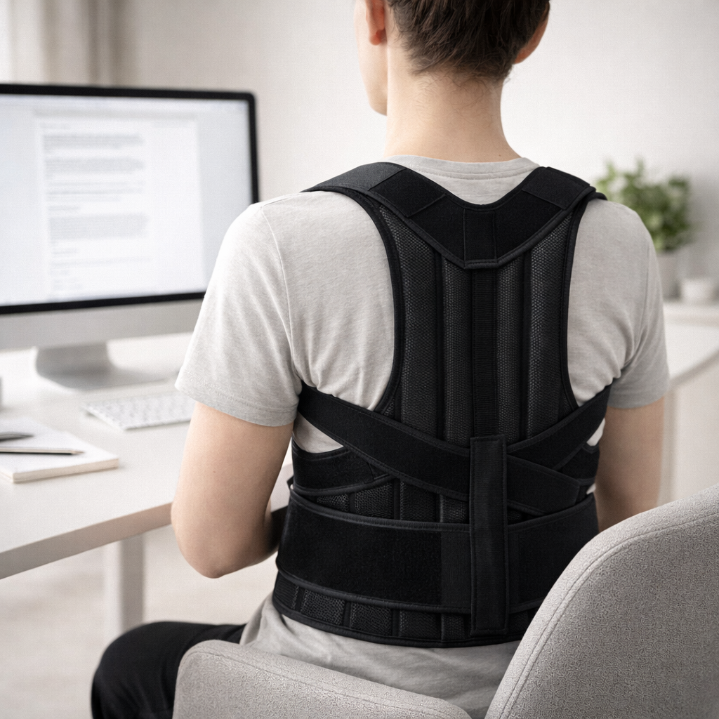 Reset your everyday posture with a breathable, adjustable brace designed to encourage a more upright position—at your desk, on the go, or at home.