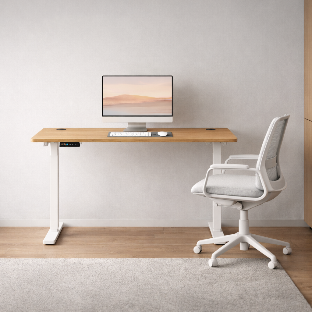 A clean sit-stand desk built for focused work—quiet electric height adjustment, smart presets, and a stable wood-and-metal frame that looks sharp in any space.