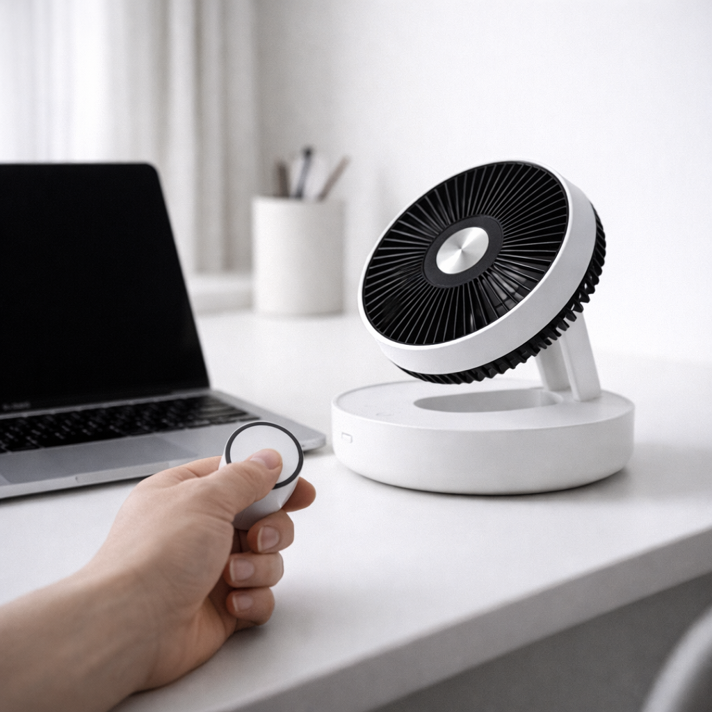 A clean, compact cooling upgrade for your desk or wall—foldable design, magnetic remote control, and smart timer for everyday comfort.