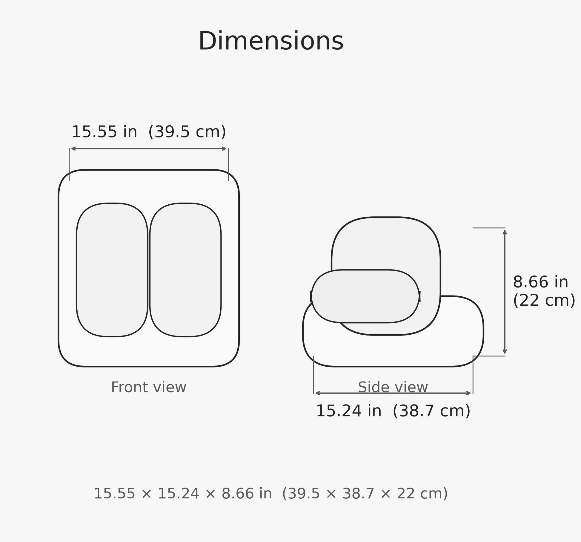 Size / Dimensions: 15.55 × 15.24 × 8.66 in (39.5 × 38.7 × 22 cm)